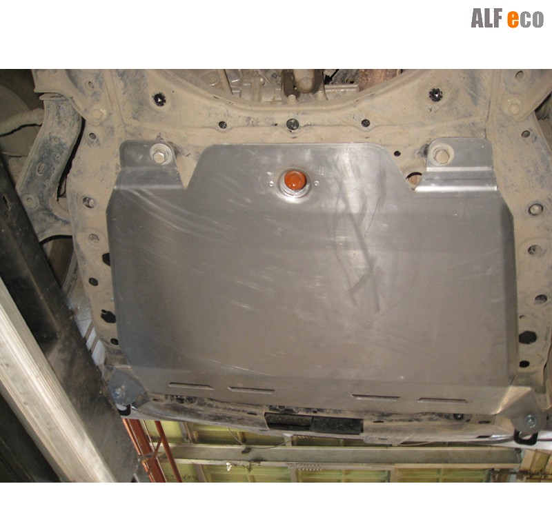 Защита картера изготовлена из алюминиевого листа толщиной 4мм (марки АМГ2м, обладает коррозийной стойкостью, а также физико-механическими свойствами, обеспечивающими надежную защиту узлов и агрегатов автомобиля, и выдерживает повышенные ударные нагрузки).